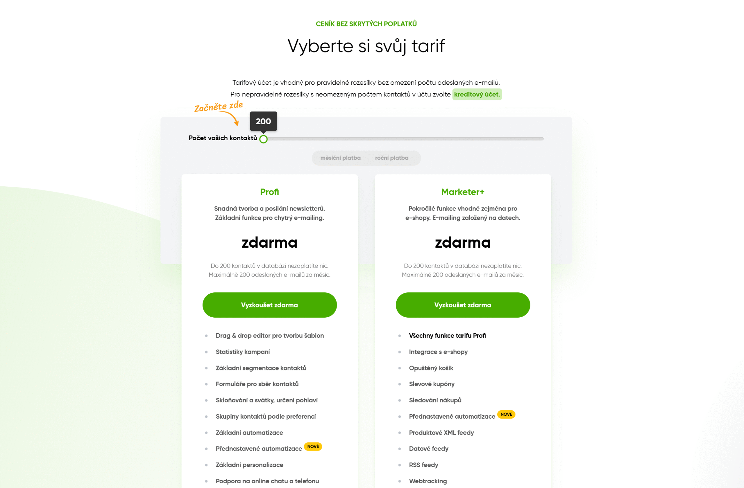 | Počet kontaktů | Měsíční cena Profi | Měsíční cena Marketer+ |