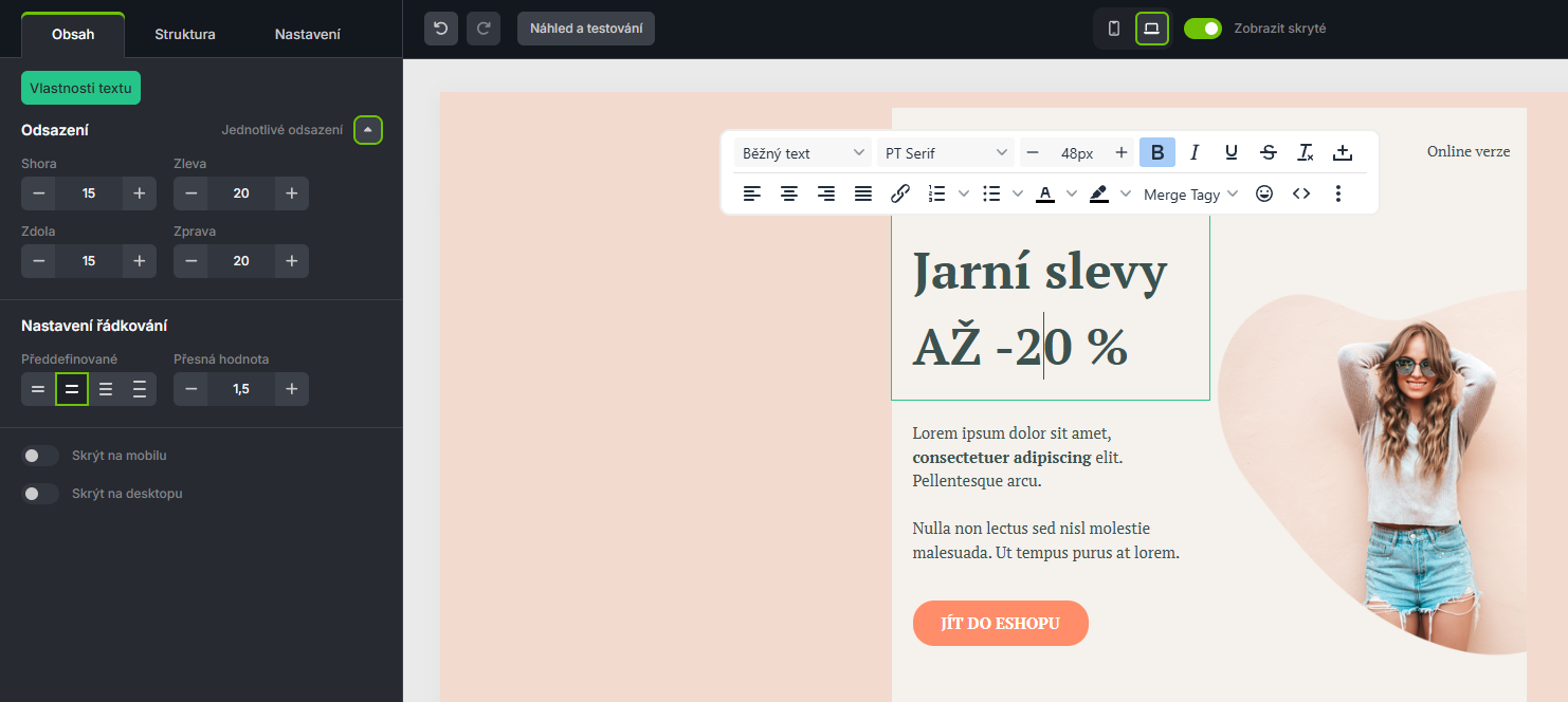 Editor e-mailů funguje na bázi drag & drop, takže stačí přesouvat bloky a upravovat obsah – bez nutnosti programování. K dispozici jsou šablony pro různé typy kampaní – od promo akcí přes přání k narozeninám až po automatizované follow-upy.